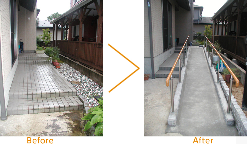 段差が続く玄関アプローチにスロープを設置しました。