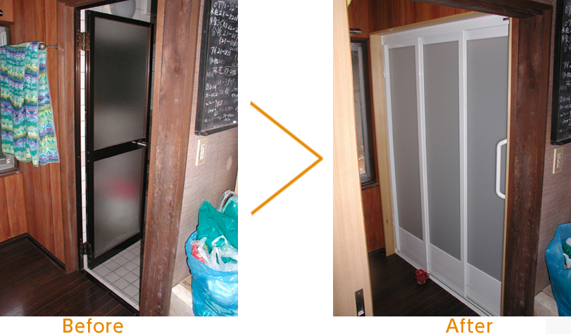 開き戸を3枚引違い戸にしたことで開口幅が広くなりました。