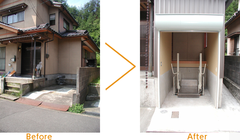 玄関脇に昇降機を設置することで、車いすを使ってひとりで外出できるようになりました。