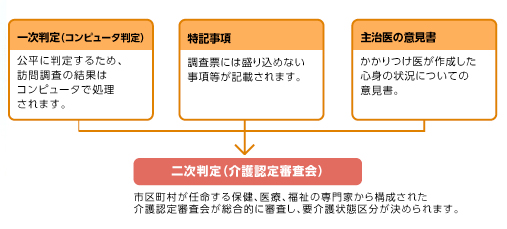 1次判定(コンピュータ判定)の結果を特記事項、主治医の意見書とともに、「介護認定審査会」で審査し、要介護状態区分が判定されます。